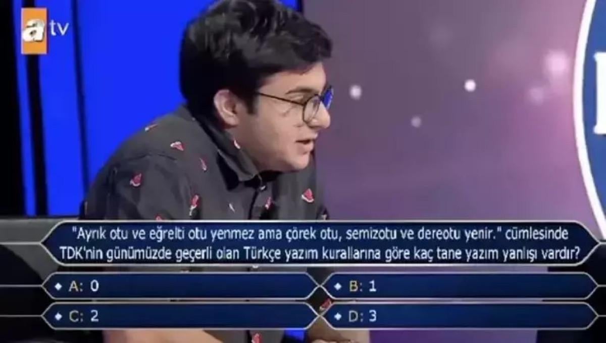 Türkçe dil bilgisi sorusu ile karşılaşan yarışmacı, şıklar arasında düşündüğü sıralarda kafasını kaldırdı.