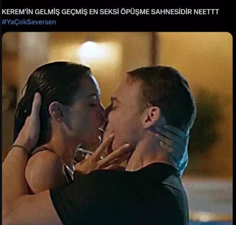Çok sevilen yaz dizisinde son bölümdeki öpüşme sahnesi gündem oldu. Kerem Bursin ve Hafsanur Sancaktutan'ın öpüşme sahnesi Twitter'ı salladı. Ya Çok Seversin'in Ateş ve Leyla'sının öpüşme sahnesine pek çok yorum yapıldı.