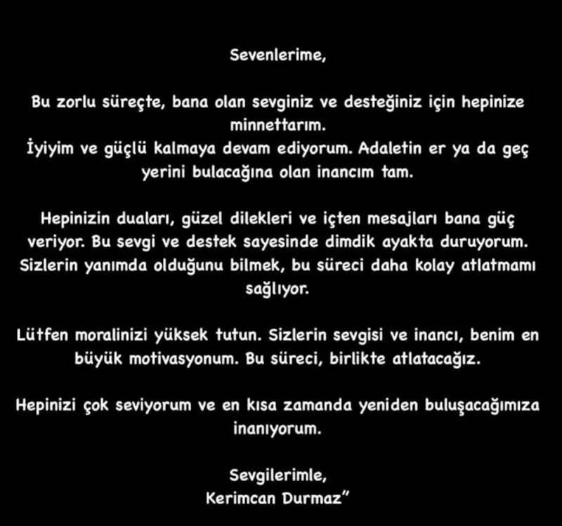 "Sevenlerime, bu zorlu süreçte, bana olan sevginiz ve desteğiniz için hepinize minnettarım. İyiyim ve güçlü kalmaya devam ediyorum. Adaletin er ya da geç yerini bulacağına olan inancım tam.