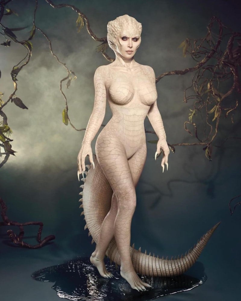 Kim Kardashian, Cadılar Bayramı için albino bir timsaha dönüştü. Plastik makyaj yaptıran dünyaca ünlü isim, tüm vücudunu pullarla kapladı.