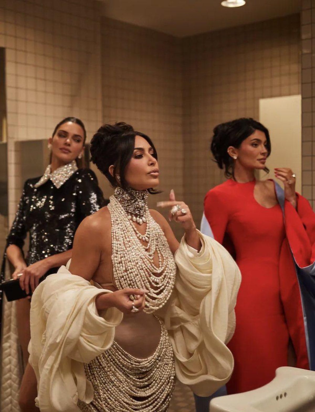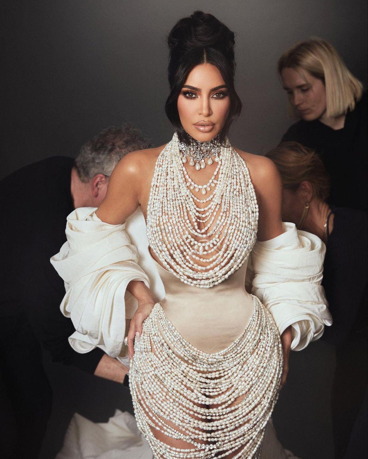 Kardashian, göz kamaştıran inci süslemeli bir kolyeyle galaya gitti. Televizyon yıldızı, bu tarzıyla 2007'deki dudak uçuklatan çıplak Playboy çekimine saygı duruşunda bulundu.