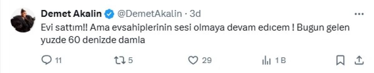 Akalın, aralık ayı için belirlenen yüzde 60 kira artış oranını, “Denizde bir damla” olarak nitelendirdi. "Evi sattım! Ancak ev sahiplerinin sesi olmaya devam edeceğim" ifadelerini kullanan sanatçı, ev sahiplerinin yaşadığı zorluklara dikkat çekeceğini de belirtti.