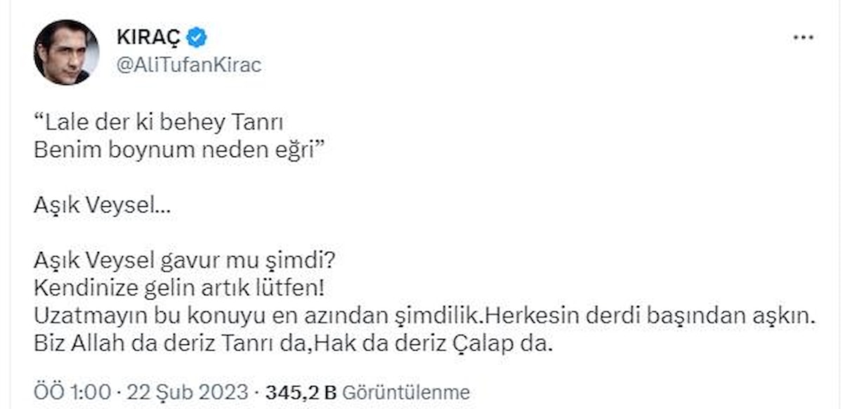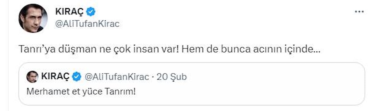 Kıraç, depremlerle ilgili yaptığı sosyal medya paylaşımında "Merhamet et yüce Tanrım" dedi. Gelen eleştiriler üzerine "Tanrı’ya düşman ne çok insan var! Hem de bunca acının içinde…" diyen Kıraç, yorum ve tartışmaların devam etmesi üzerine şu paylaşımı yaptı;
