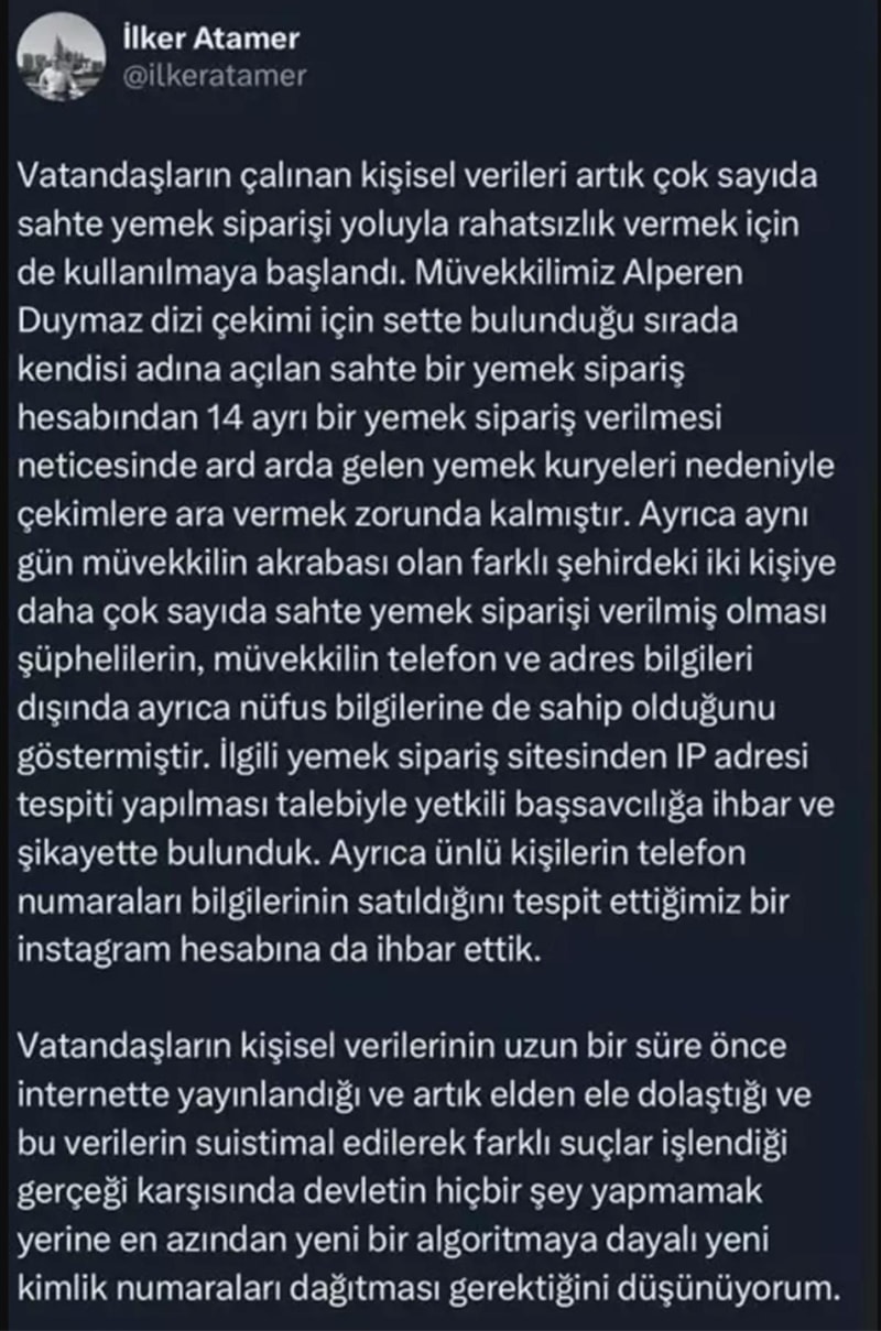 ''Vatandaşların çalınan kişisel verileri artık çok sayıda sahte yemek siparişi yoluyla rahatsızlık vermek için de kullanılmaya başlandı. Müvekkilimiz Alperen Duymaz, dizi çekimi için sette bulunduğu sırada kendisi adına açılan sahte bir yemek sipariş hesabından 14 ayrı bir yemek sipariş verilmesi neticesinde art arda gelen yemek kuryeleri nedeniyle çekimlere ara vermek zorunda kalmıştır. Ayrıca aynı gün müvekkilin akrabası olan farklı şehirdeki iki kişiye daha çok sayıda sahte yemek siparişi verilmiş olması şüphelilerin, müvekkilin telefon ve adres bilgileri dışında ayrıca nüfus bilgilerine de sahip olduğunu göstermiştir. İlgili yemek sipariş sitesinden IP adresi tespiti yapılması talebiyle yetkili başsavcılığa ihbar ve şikâyette bulunduk. Ayrıca ünlü kişilerin telefon numaraları bilgilerinin satıldığını tespit ettiğimiz bir Instagram hesabına da ihbar ettik. Vatandaşların kişisel verilerinin uzun bir süre önce internette yayınlandığı ve artık elden ele dolaştığı ve bu verilerin suistimal edilerek farklı suçlar işlendiği gerçeği karşısında devletin hiçbir şey yapmamak yerine en azından yeni bir algoritmaya dayalı yeni kimlik numaraları dağıtması gerektiğini düşünüyorum.''