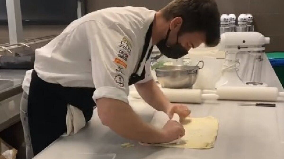 “Elmalı Strudel” adlı tatlı için kollarını sıvayan Tatlıtuğ hamur açtı, sonrasında malzemelerini dizdi.