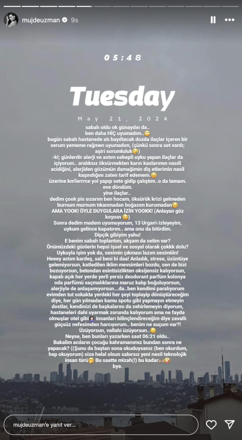 Uzman, sözlerine, "Bugün sabah hastanede atı bayıltacak dozda ilaçlar içeren bir serum yememe rağmen uyumadım (çünkü sonra set vardı; aşırı sorumluluk)." diyerek başladı.