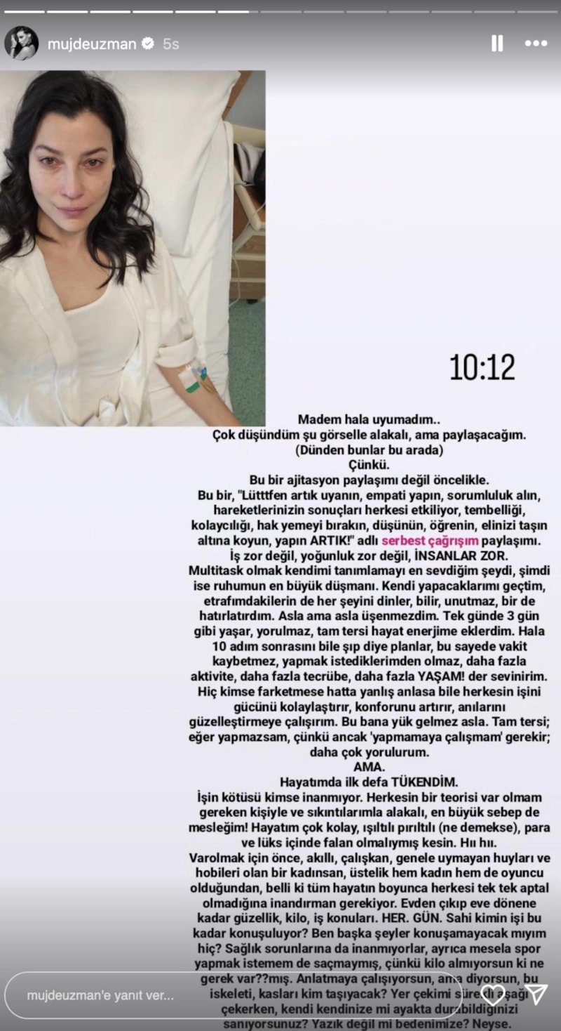 Ardından hastane yatağında kolunda serumla paylaşım yaparak "Hayatımda ilk defa TÜKENDİM." dedi.