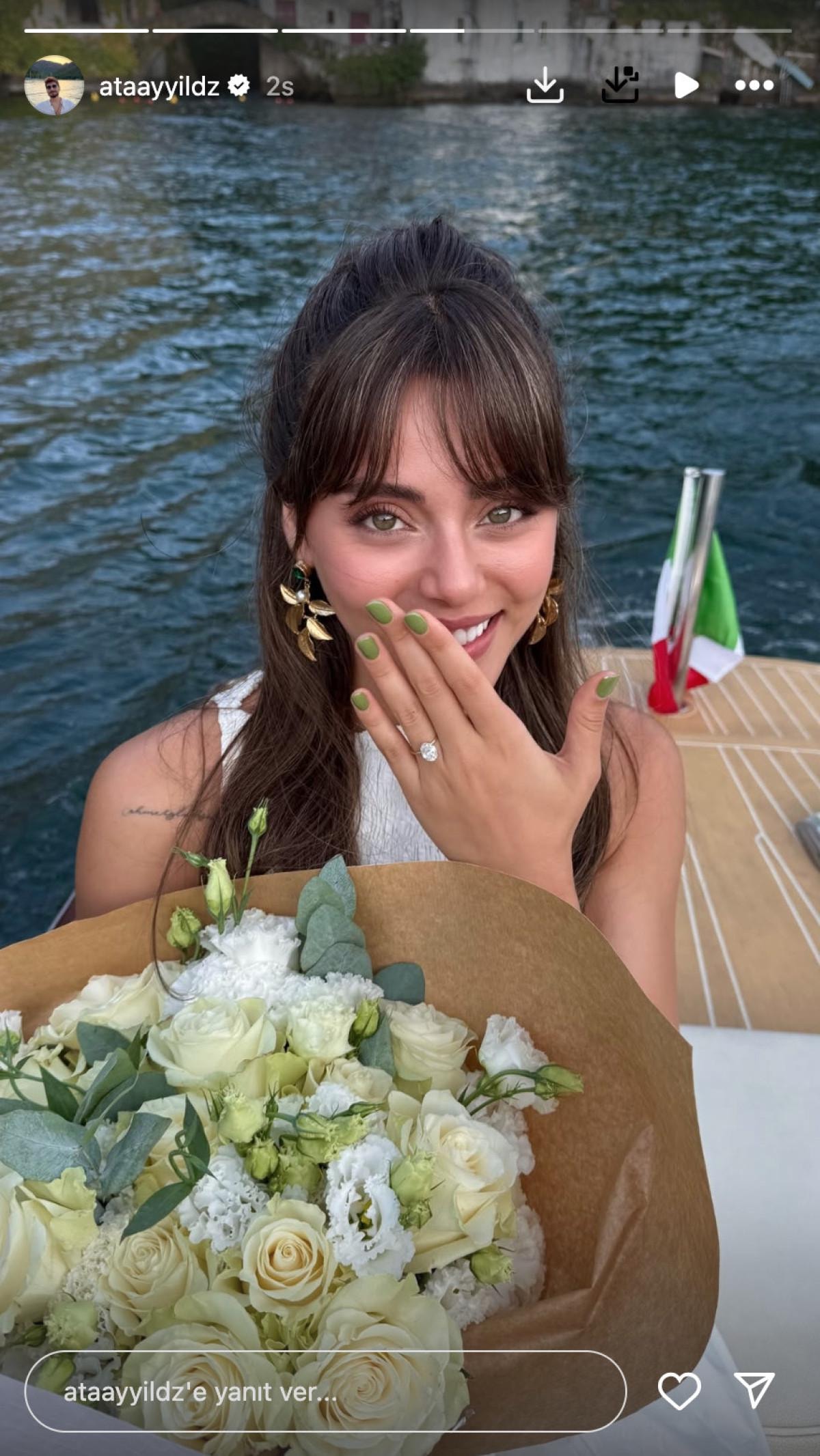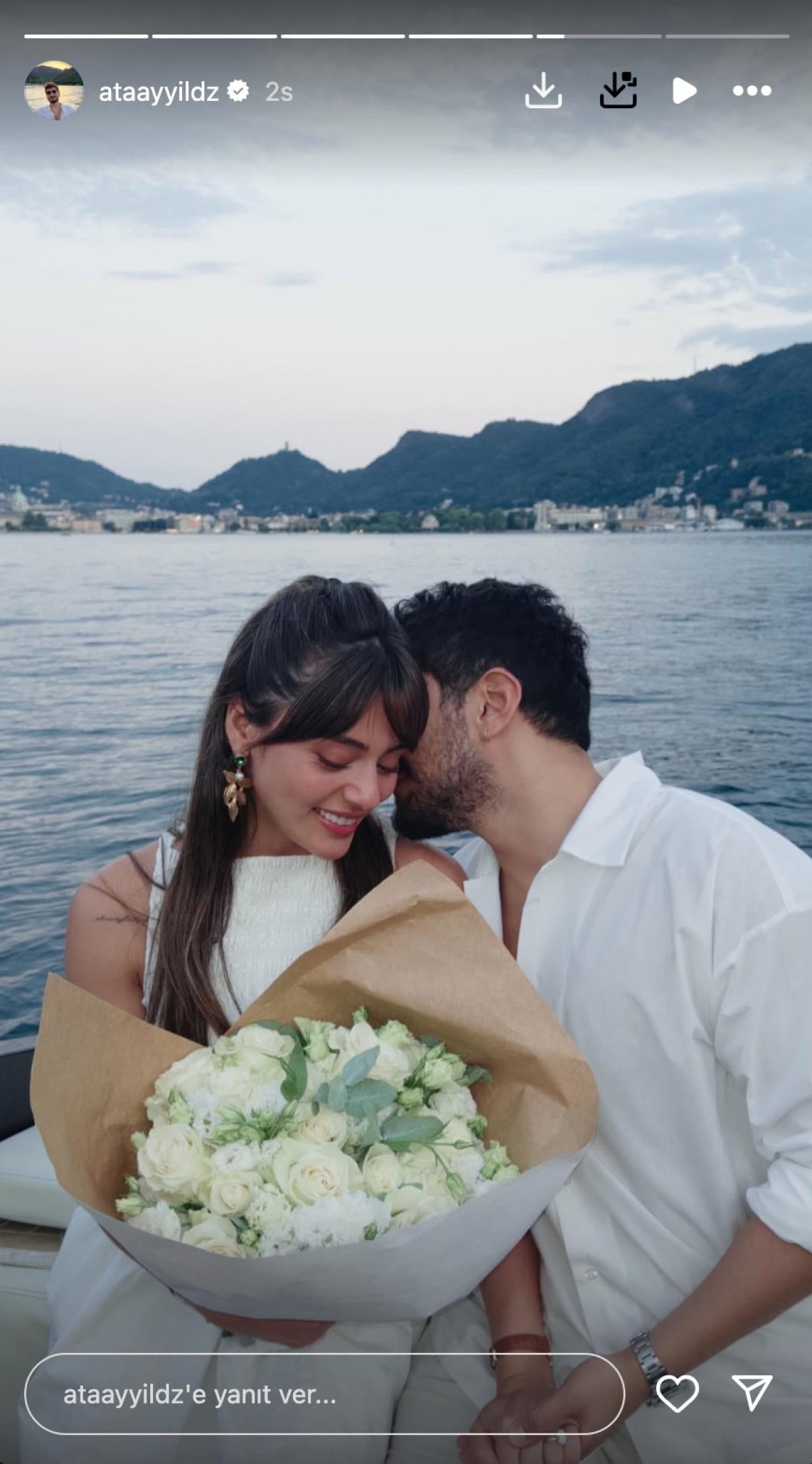 Ata Ayyıldız, sevgilisi Sıla Türkoğlu'na teknede sürpriz evlilik teklifinde bulundu. Ardından kendisine "Evet" diyen oyuncuyu yüzüğü ve çiçeğiyle paylaştı.