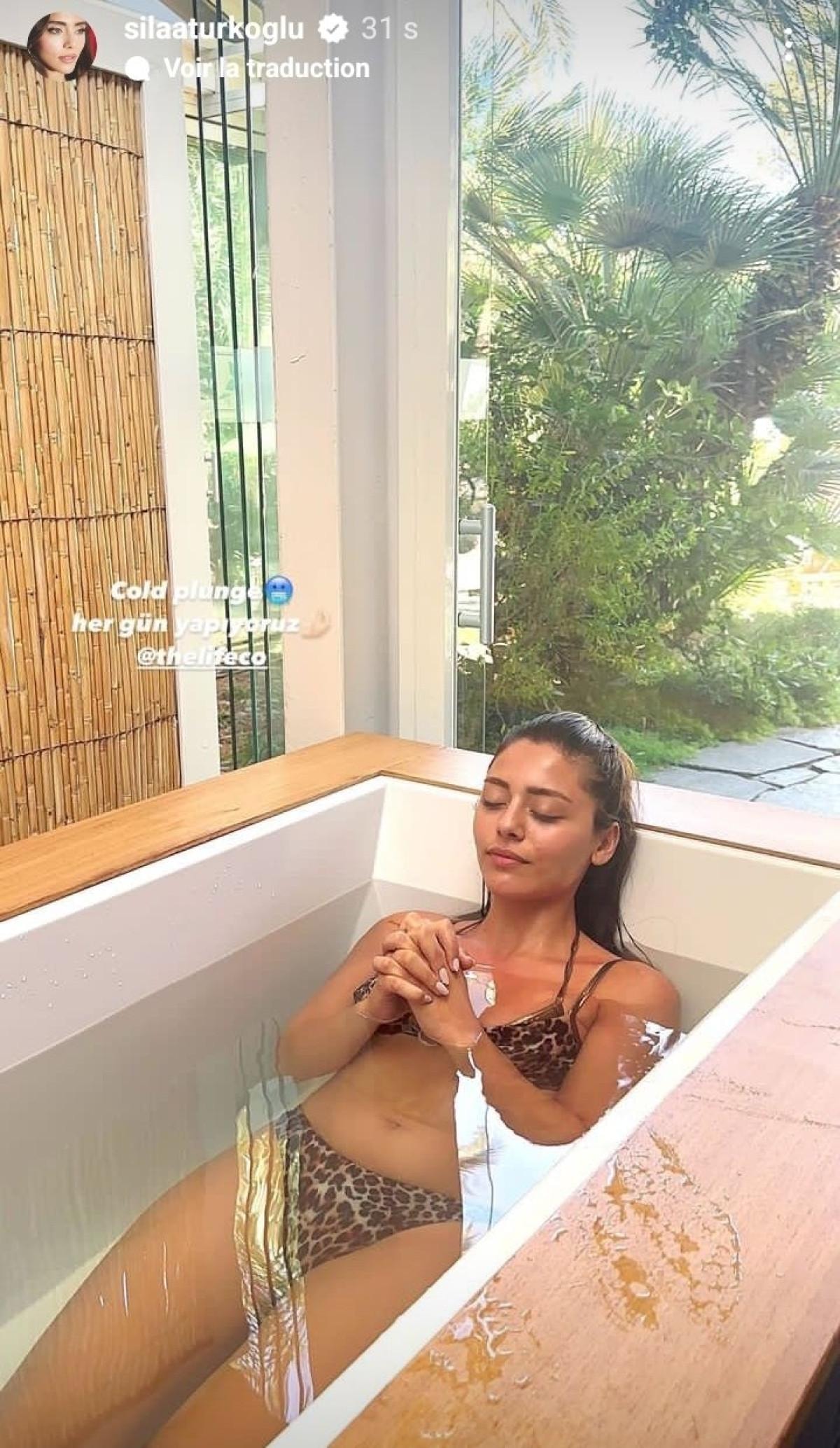 Leopar desenli bikinisiyle suya giren 25 yaşındaki ünlü oyuncu, o anları; "Cold plunge, her gün yapıyoruz" notunu düşerek sosyal medya hesabından paylaştı.