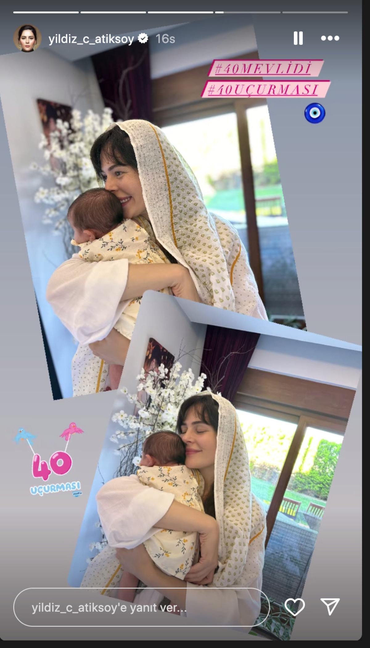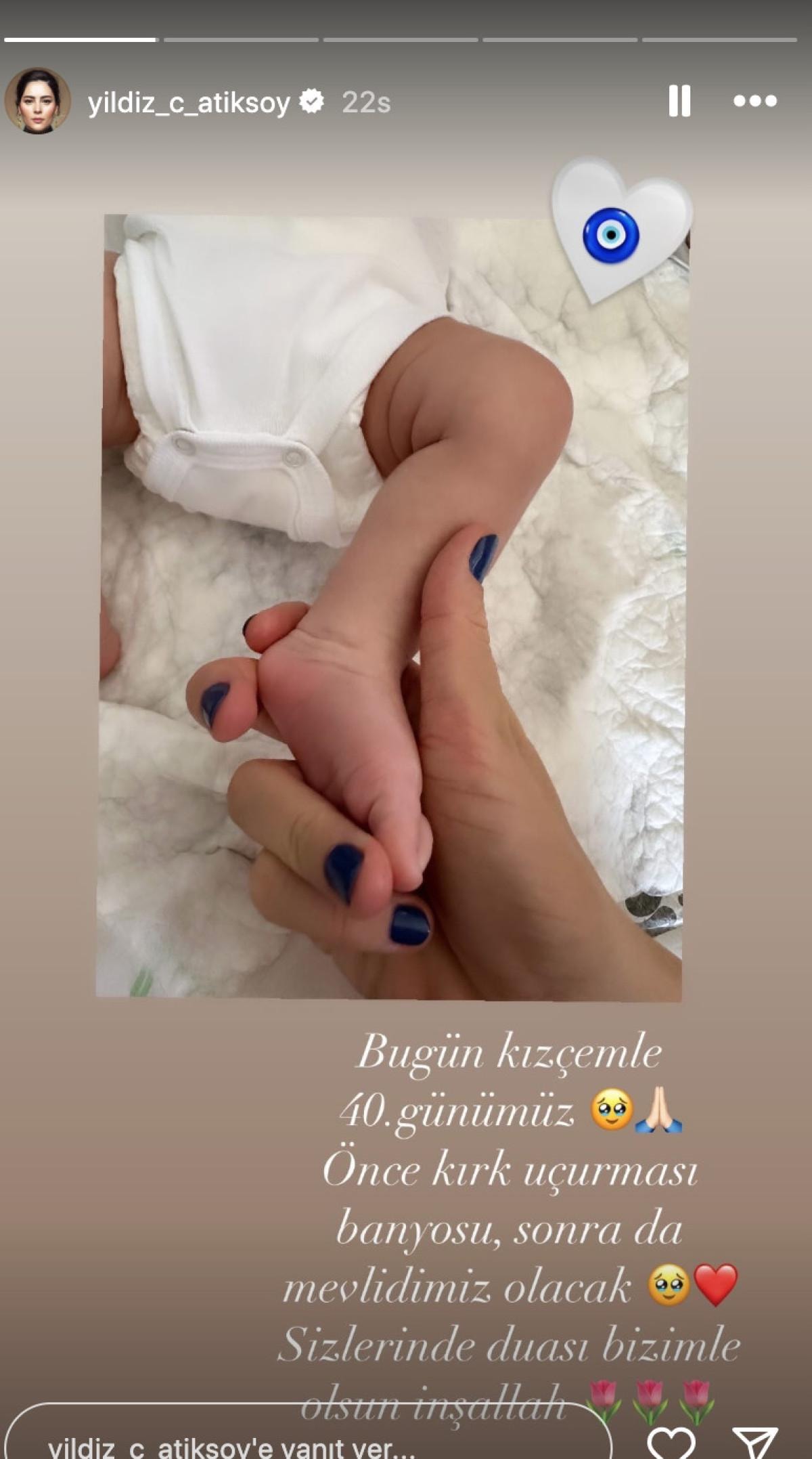 O anları, sosyal medya hesabından yayınlayan Yıldız Çağrı Atiksoy; "Bugün kızçemle 40'ıncı günümüz. Önce 40 uçurması banyosu sonra da mevlidimiz olacak. Sizlerin de duası bizimle olsun inşallah." ifadelerini kullandı.