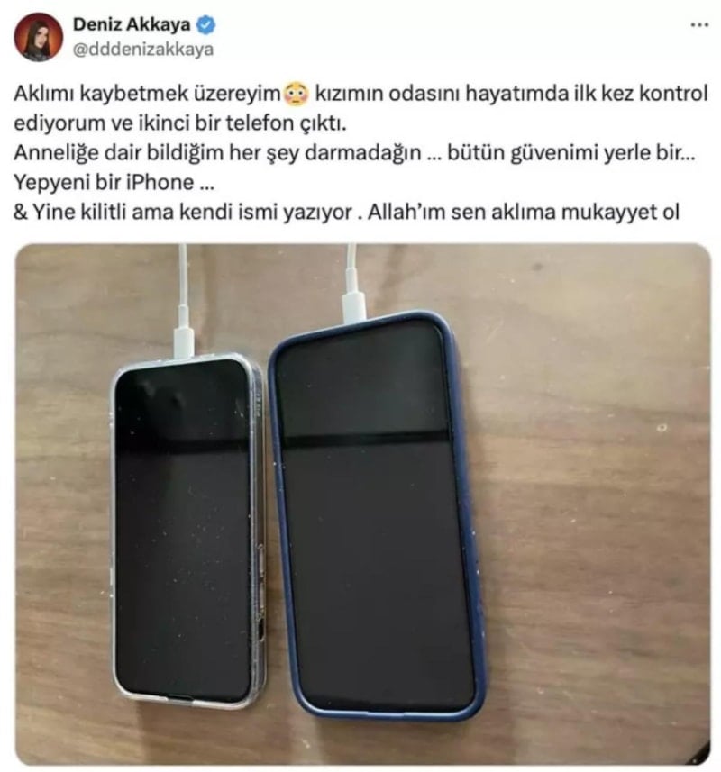 Eski manken, Twitter (X) hesabından bu sefer de kızına ait ikinci bir telefon bulduğunu açıkladı. Akkaya, "Anneliğe dair bildiğim her şey darmadağın … Bütün güvenimi yerle bir… Yepyeni bir iPhone… Yine kilitli ama kendi ismi yazıyor. Allah’ım sen aklıma mukayyet ol.