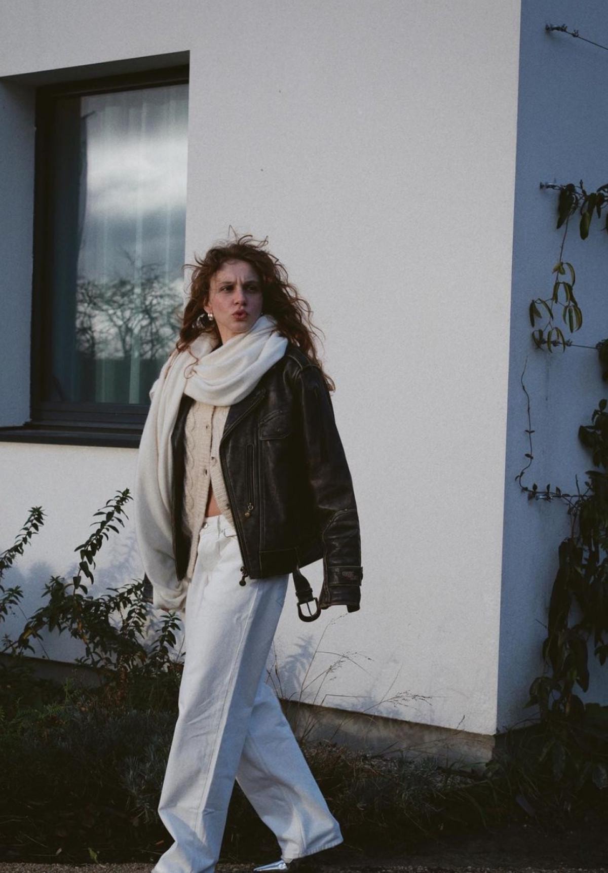 Beyaz pantolonu, deri ceketi ve atkısıyla cesur bir kombin yapan Ahsen Eroğlu, üstüne giydiği yün hırkasının düğmelerini açık bıraktı.