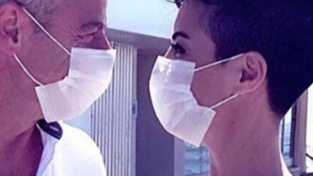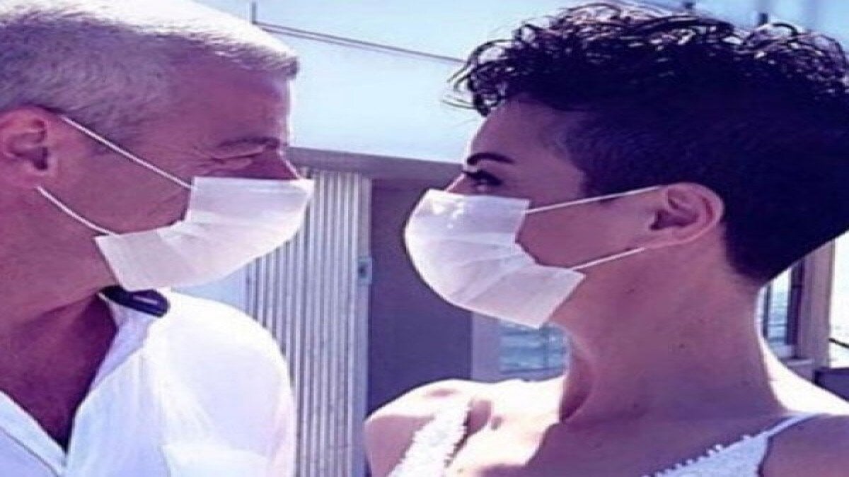 Çift, İzmir'de gerçekleşen nikah sonrası yüzlerinde maskelerle bu pozu verdi. İddiaya göre Levent Yüksel, eşiyle konserinde tanıştı.