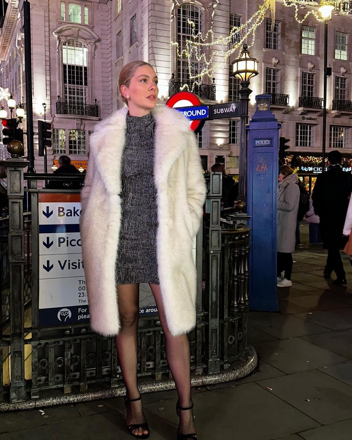 Mini elbisesini siyah çorapla tamamlayan Bergüzar Korel, paylaşımına şu notu düştü: