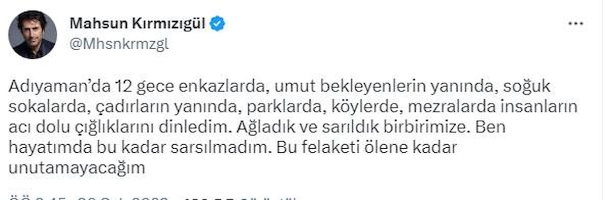 "Adıyaman’da 12 gece enkazlarda, umut bekleyenlerin yanında, soğuk sokaklarda, çadırların yanında, parklarda, köylerde, mezralarda insanların acı dolu çığlıklarını dinledim. Ağladık ve sarıldık birbirimize. Ben hayatımda bu kadar sarsılmadım. Bu felaketi ölene kadar unutamayacağım."