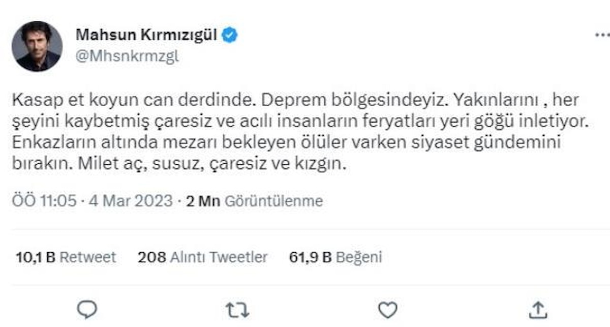 Meral Akşener'in açıklamalarının ardından Twitter hesabından paylaşım yapan Mahsun Kırmızıgül "Kasap et koyun can derdinde. Deprem bölgesindeyiz. Her şeyini kaybetmiş çaresiz ve acılı insanların feryatları yeri göğü inletiyor. Enkazların altında mezarı bekleyen ölüler varken siyaset gündemini bırakın. Milet aç, susuz, çaresiz ve kızgın." dedi.