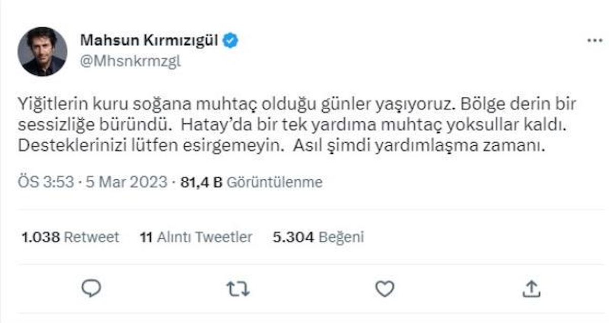 Kırmızıgül daha sonra yaptığı paylaşımda ise "Yiğitlerin kuru soğana muhtaç olduğu günler yaşıyoruz. Bölge derin bir sessizliğe büründü. Hatay'da bir tek yardıma muhtaç yoksullar kaldı. Desteklerinizi lütfen esirgemeyin. Asıl şimdi yardımlaşma zamanı." diyerek tüm dikkatlerin bu bölgelerde olması gerektiğine vurgu yaptı.