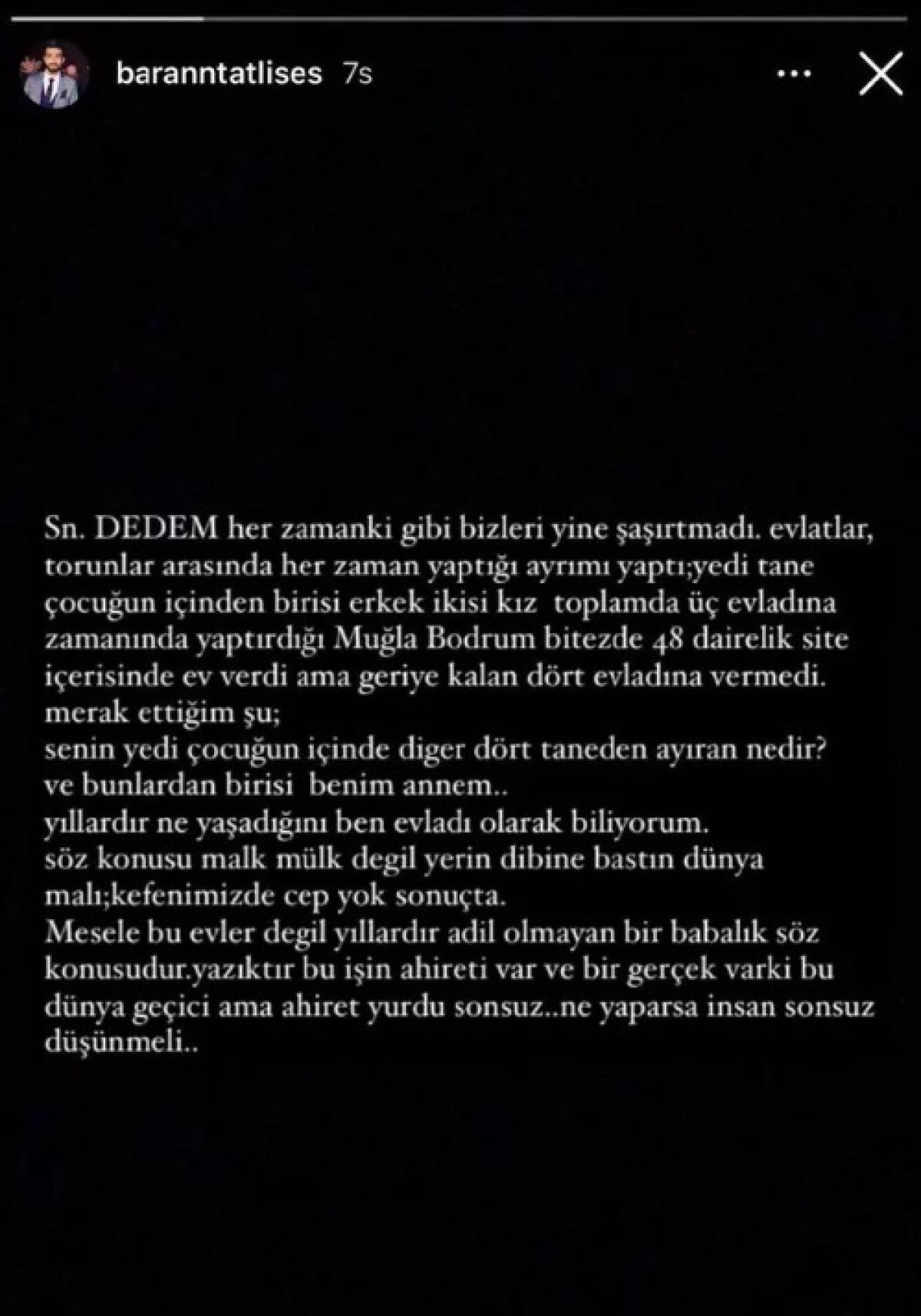 İbrahim Tatlıses'in kızı Gülşen'in oğlu Burak Baran, sosyal medyadan isyan etti. Baran, dedesinin, yedi çocuğunun içinden birisi erkek ikisi kız toplamda üç evladına zamanında yaptırdığı Muğla'daki siteden ev verdiğini, kendilerine ise vermediğini söyledi.