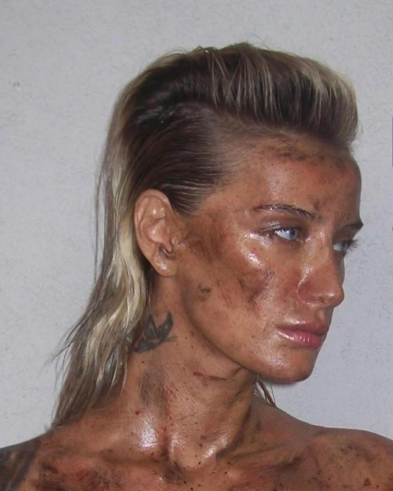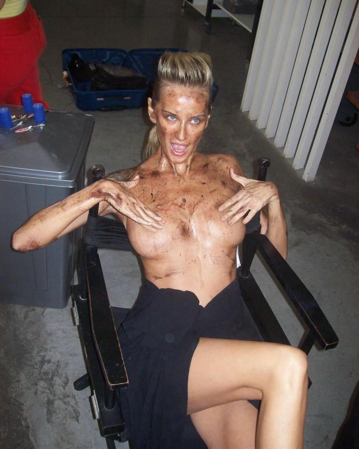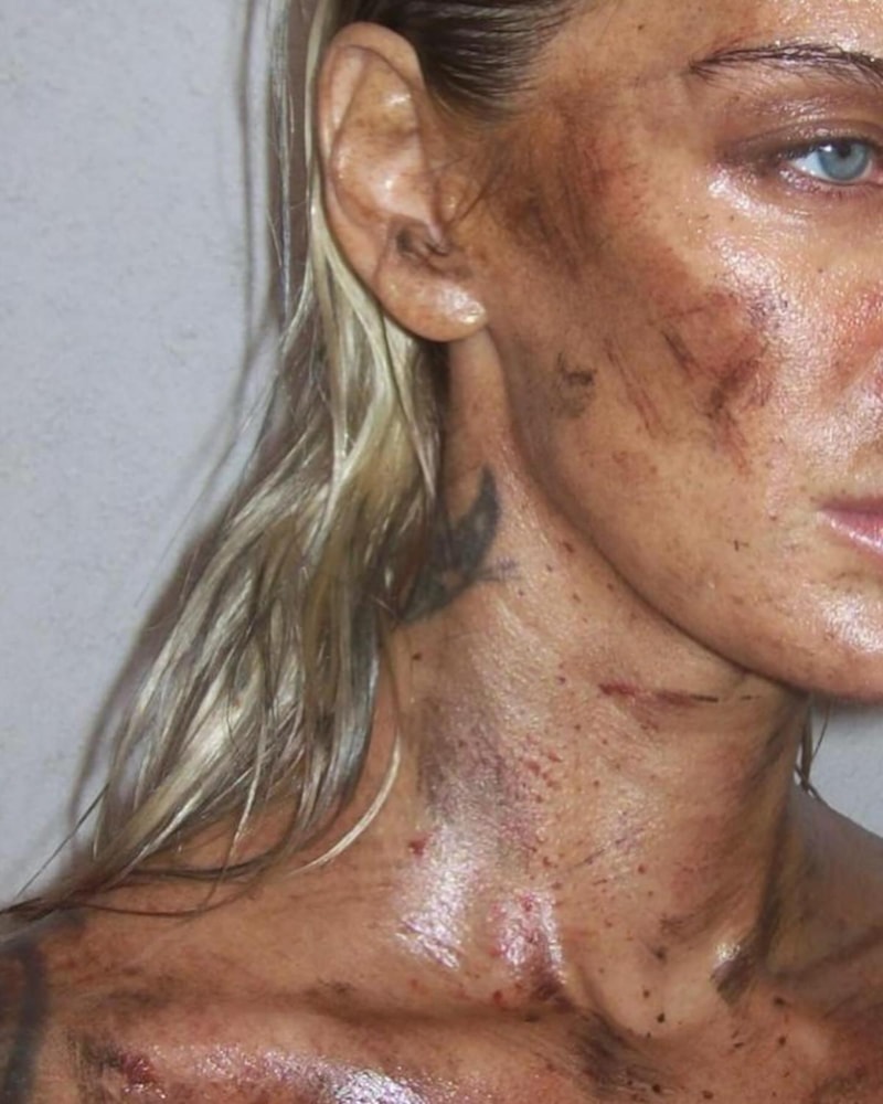 Yüzüne makyajla yara izleri yapılan güzel model, göğüs uçlarını elleriyle kapatarak kameralara poz verdi.