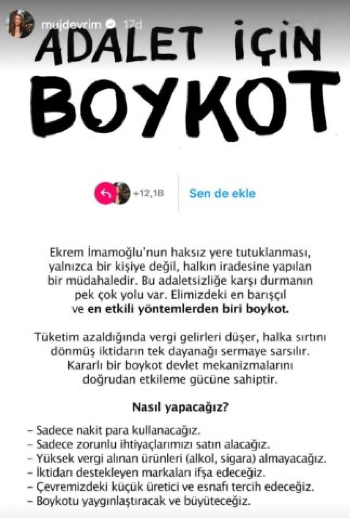 Oyuncu Müjde Evrim Alasya, sosyal medyadan yaptığı "boykot" çağrısında şu ifadeleri kullandı:
