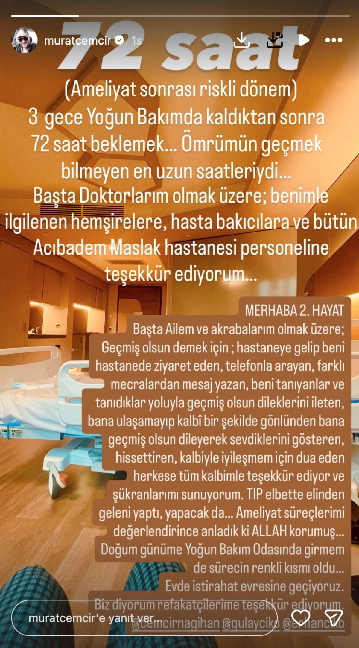"Merhaba 2. hayat. Başta ailem ve akrabalarım olmak üzere; geçmiş olsun demek için; hastaneye gelip beni hastanede ziyaret eden, telefonla arayan, farklı mecralardan mesaj yazan, beni tanıyanlar ve tanıdıkları yoluyla geçmiş olsun dileklerini ileten, bana ulaşamayıp kalbi bir şekilde gönlünden bana geçmiş olsun dileyerek sevdiklerini gösteren, hissettiren, kalbiyle iyileşmem için dua eden herkese tüm kalbimle teşekkür ediyor ve şükranlarımı sunuyorum.