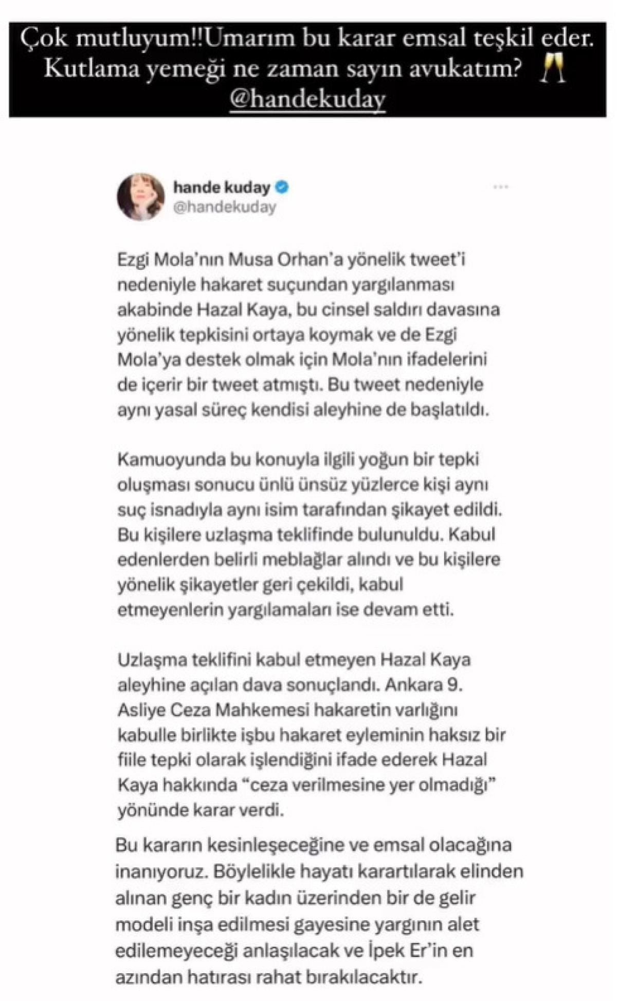 Kamuoyunda bu konuyla ilgili yoğun bir tepki oluşması sonucu ünlü ünsüz yüzlerce kişi aynı suç isnadıyla aynı isim tarafından şikayet edildi. Bu kişilere uzlaşma teklifinde bulunuldu. Kabul edenlerden belirli meblağlar alındı ve bu kişilere yönelik şikayetler geri çekildi, kabul etmeyenlerin yargılamaları ise devam etti. Uzlaşma teklifini kabul etmeyen Hazal Kaya aleyhine açılan dava sonuçlandı. Ankara 9. Asliye Ceza Mahkemesi hakaretin varlığını kabulle birlikte işbu hakaret eyleminin haksız bir fiile tepki olarak işlendiğini ifade ederek Hazal Kaya hakkında ‘ceza verilmesine yer olmadığı' yönünde karar verdi. Bu kararın kesinleşeceğine ve emsal olacağına inanıyoruz. Böylelikle hayatı karartılarak elinden alınan genç bir kadın üzerinden bir de gelir modeli inşa edilmesi gayesine yargının alet edilemeyeceği anlaşılacak ve İpek Er'in en azından hatırası rahat bırakılacaktır.