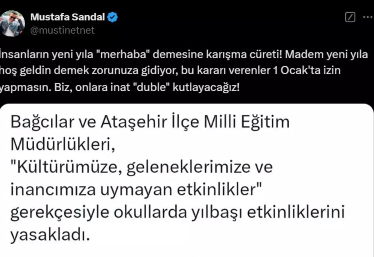 Sandal "İnsanların yeni yıla 'merhaba' demesine karışma cüreti! Madem yeni yıla hoş geldin demek zorunuza gidiyor, bu kararı verenler 1 Ocak'ta izin yapmasın. Biz, onlara inat 'duble' kutlayacağız!" dedi.