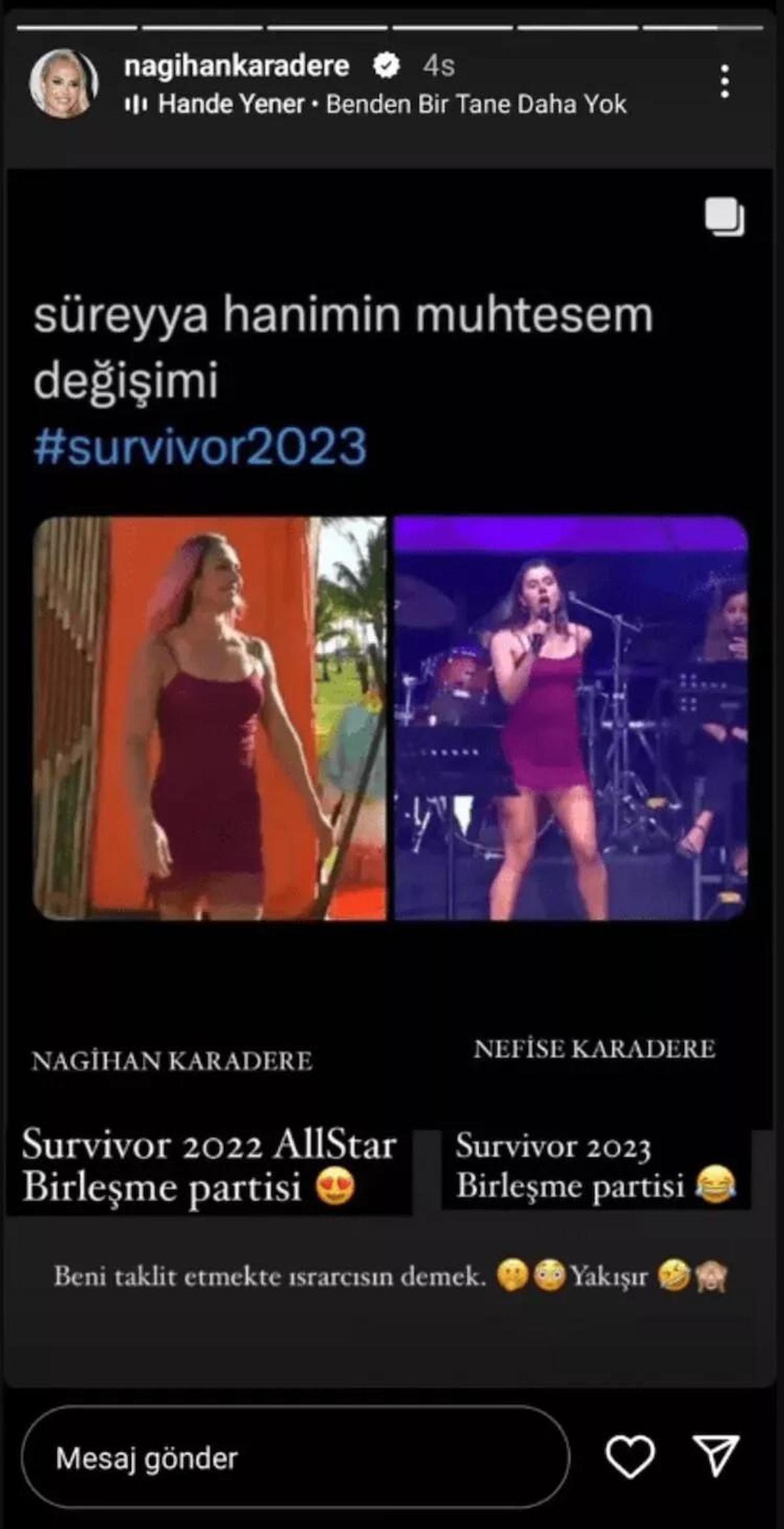 AllStar birleşme partisinde giydiği kıyafet ile Survivor 2023'te Nefise Karatay'ın giydiği kıyafeti kıyaslayan Nagihan Karadere paylaşımına şu notu düştü:
