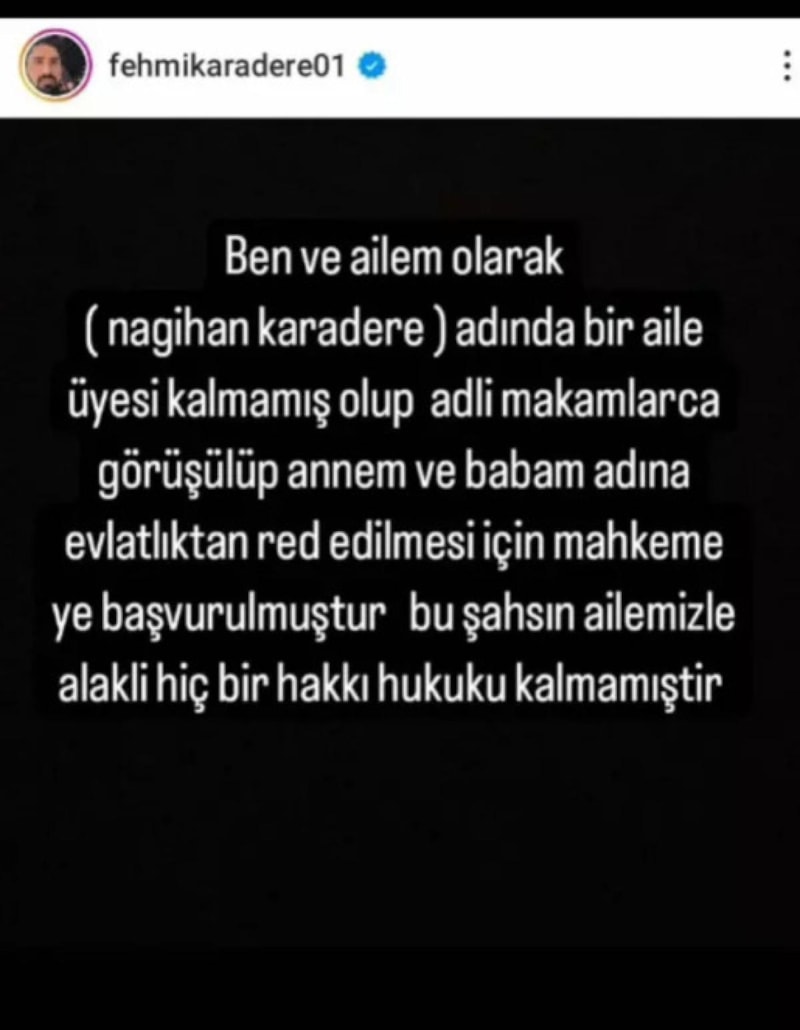 Fehmi Karadere, Nagihan Karadere'nin evlatlıktan reddedilmesi için anne ve babasının mahkemeye başvurduğunu iddia etti.
