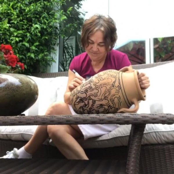 Nazan Öncel korona günlerinde boş durmuyor. Daha önce sutyenden maske dikip paylaşan Öncel, bu kez bir kil vazonun üzerine resim çizerken bir kare paylaştı.