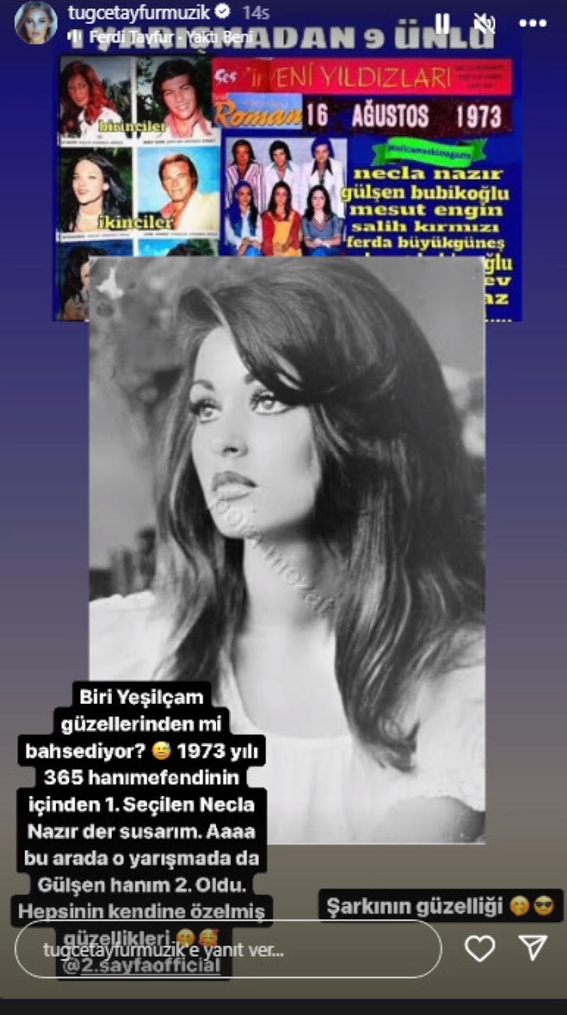 Tuğçe Tayfur, annesi Necla Nazır’ın birinci olduğu yarışmada Gülşen Bubikoğlu’nun ikinci olduğunu söyleyerek "Biri Yeşilçam güzellerinden mi bahsediyor?1973 yılı 365 hanımefendinin içinden birinci seçilen Necla Nazır der susarım. Bu arada yarışmada Gülşen Hanım ikinci oldu.” dedi.