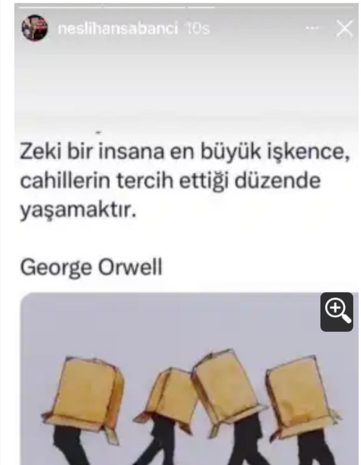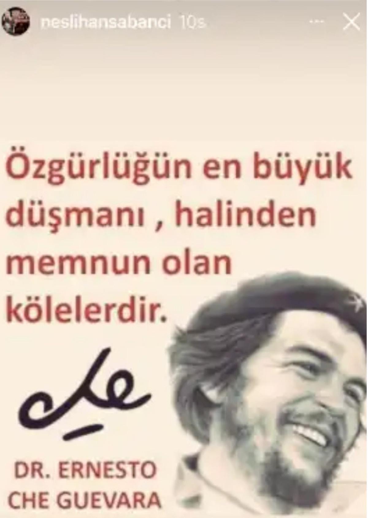 Sosyal medya hesabından paylaşım yapan Neslihan Sabancı, tepkisini Atatürk, Che Guevera ve George Orwell'in sözleriyle anlatmaya çalıştı.