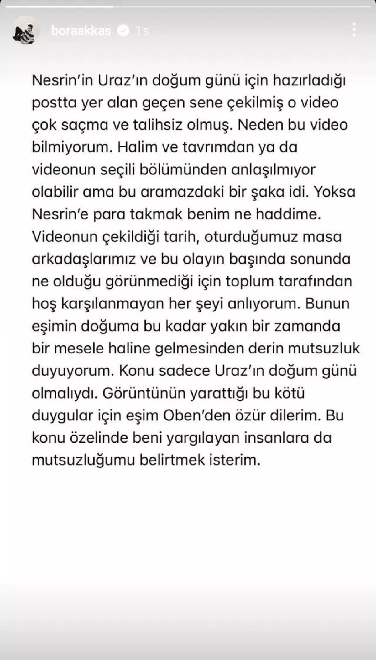 Akkaş yaptıpı açıklamada "Nesrin'in Uraz'ın doğum günü için hazırladığı postta yer alan geçen sene çekilmiş o video çok saçma ve talihsiz olmuş. Neden bu video bilmiyorum. Halim ve tavrımdan ya da videonun seçili bölümlerinden anlaşılmıyor olabilir ama bu aramızdaki bir şakaydı.