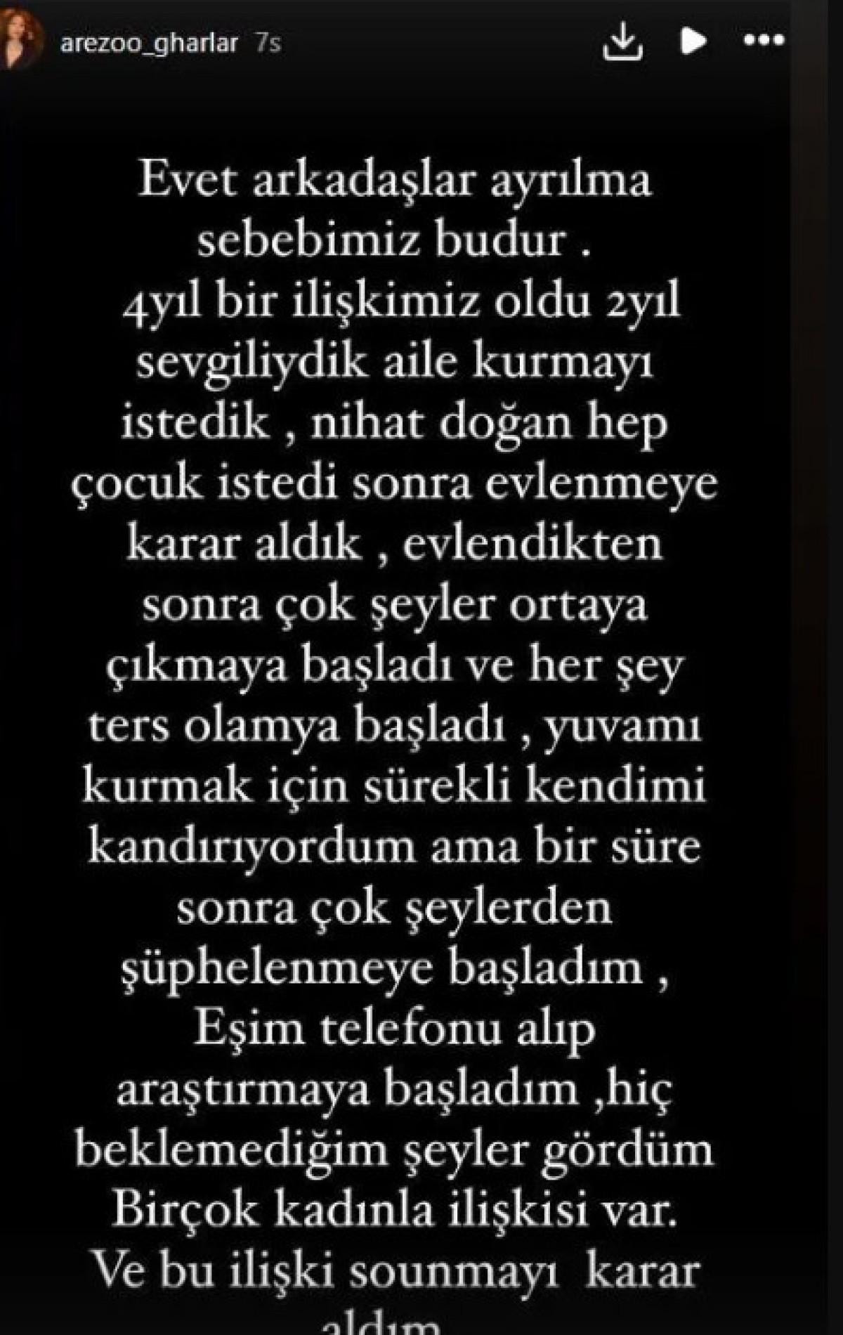 Arzu Doğan, sosyal medya hesabında yaptığı açıklamada şu ifadeleri kullandı: "Evet arkadaşlar, ayrılma nedenimiz budur: 4 yıl bir ilişkimiz oldu, 2 yıl sevgiliydik... Nihat Doğan hep çocuk istedi, sonra evlenmeye karar verdik.