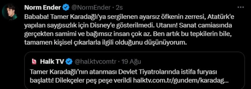 Sosyal medya hesabından açıklama yapan Norm Ender, "Tamer Karadağlı'ya sergilenen ayarsız öfkenin zerresi, Atatürk'e yapılan saygısızlık için Disney'e gösterilmedi. Utanın" dedi.
