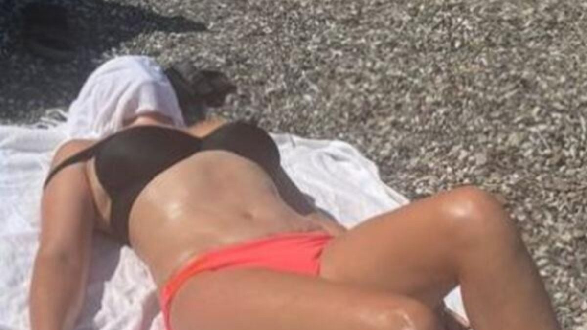 Kavurucu sıcaktan bunalan oyuncu, bikinisiyle sere serpe yere uzanarak yüzünü de havluyla kapattı.
