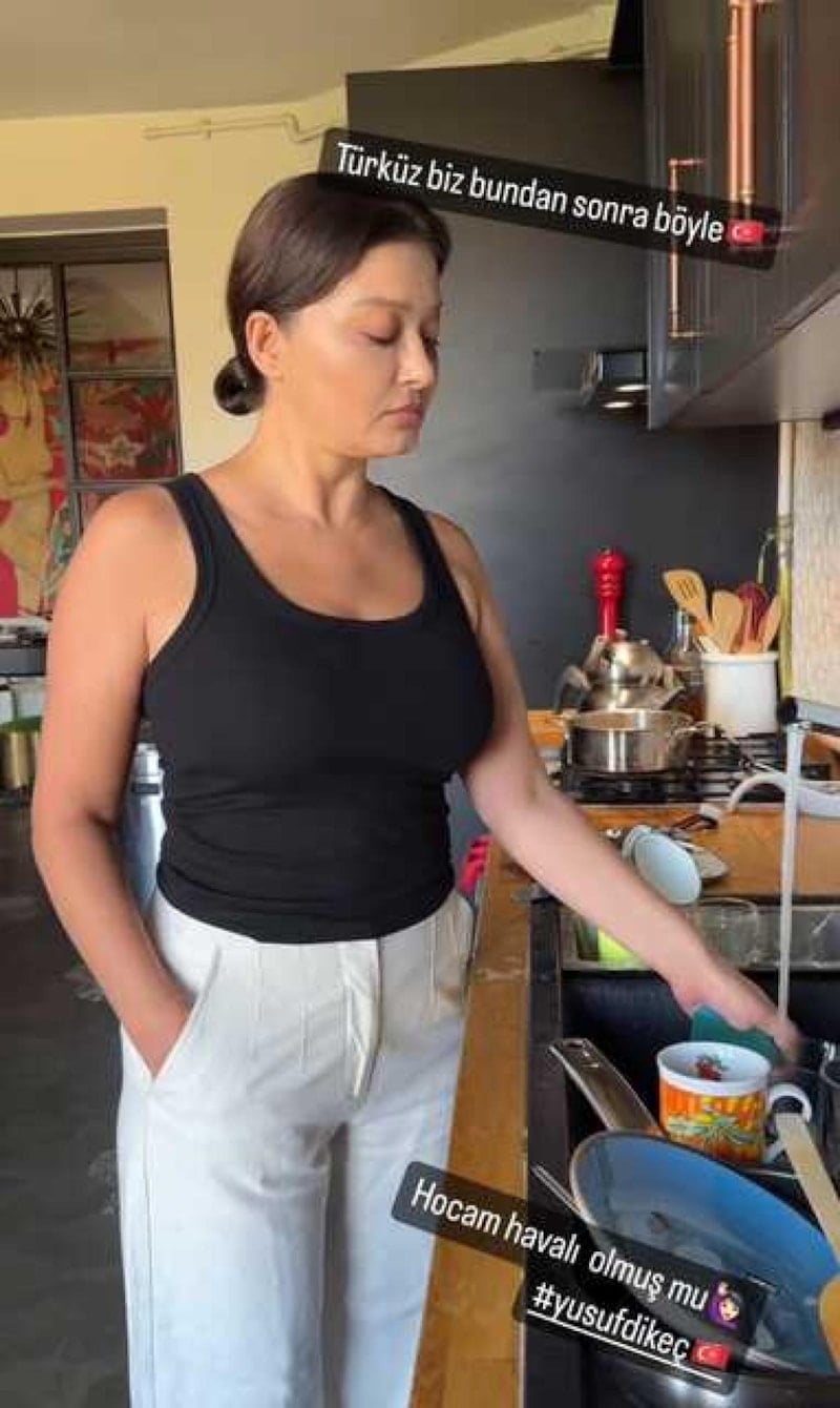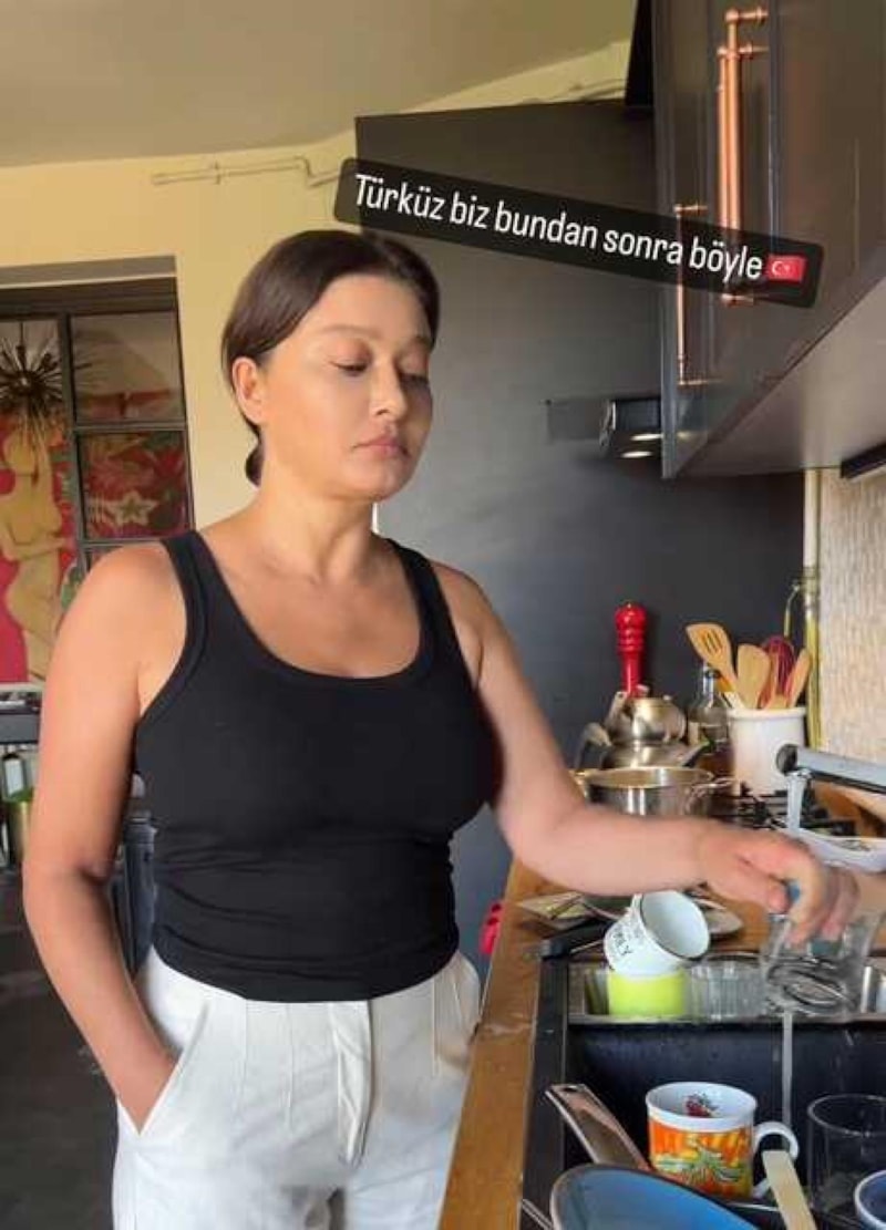 Ünlü oyuncu, evinin mutfağında, bir eli cebinde diğer eliyle bulaşıkları yıkadığı bir videosunu takipçileriyle paylaştı.