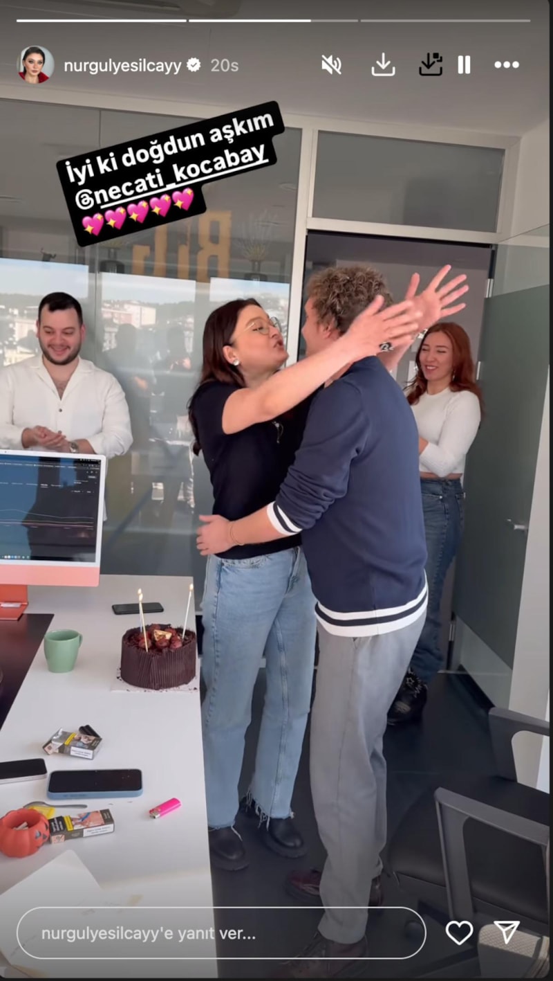 Sevilen isim, daha sonra 4.6 milyon takipçisinin olduğu Instagram hesabından Kocabay’ın ofisine elinde pastayla giderek çalışanlarla birlikte sevgilisine sürpriz yaptığı anları paylaştı. O anları sosyal medyada paylaşan Yeşilçay, "İyi ki doğdun, iyi ki varsın!" notunu düştü.