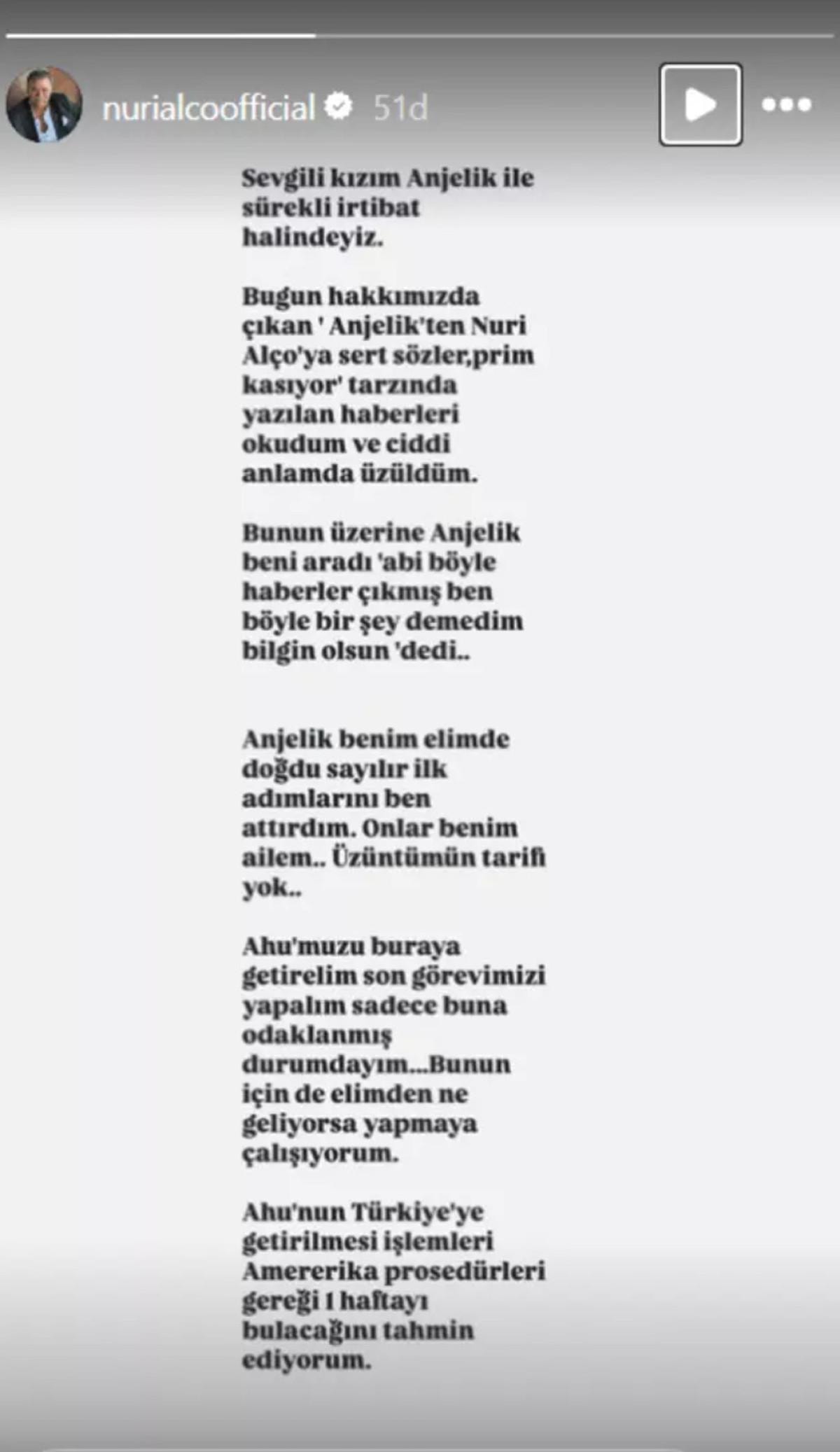 Nuri Alço açıklamasında "Sevgili kızım Anjelik ile sürekli irtibat halindeyiz." dedi. ve şunları söyledi: