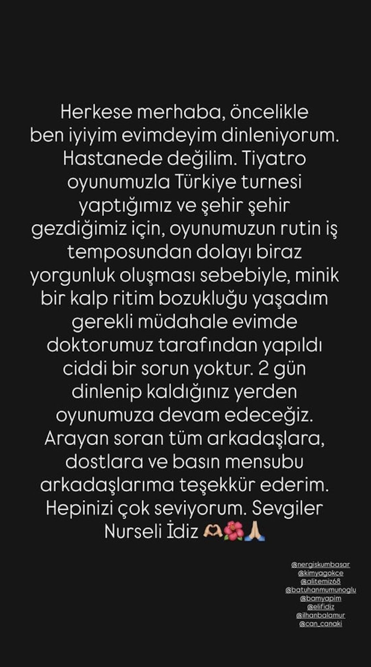 "Herkese merhaba, öncelikle ben iyiyim, evimdeyim dinleniyorum. Hastanede değilim. Tiyatro oyunumuzla Türkiye turnesi yaptığımız ve şehir şehir gezdiğimiz için, oyunumuzun rutin iş temposundan dolayı biraz yorgunluk oluşması sebebiyle minik bir kalp ritim bozukluğu yaşadım. Gerekli müdahale evimde doktorumuz tarafından yapıldı, ciddi bir sorun yoktur. 2 gün dinlenip kaldığımız yerden oyunumuza devam edeceğiz. Arayan soran tüm arkadaşlara, dostlara ve basın mensubu arkadaşlara çok teşekkür ederim. Hepinizi çok seviyorum. Sevgiler."