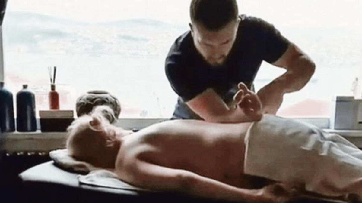 Gelen masör İdiz’in omuzlarına, sırtına masaj yapıyor.