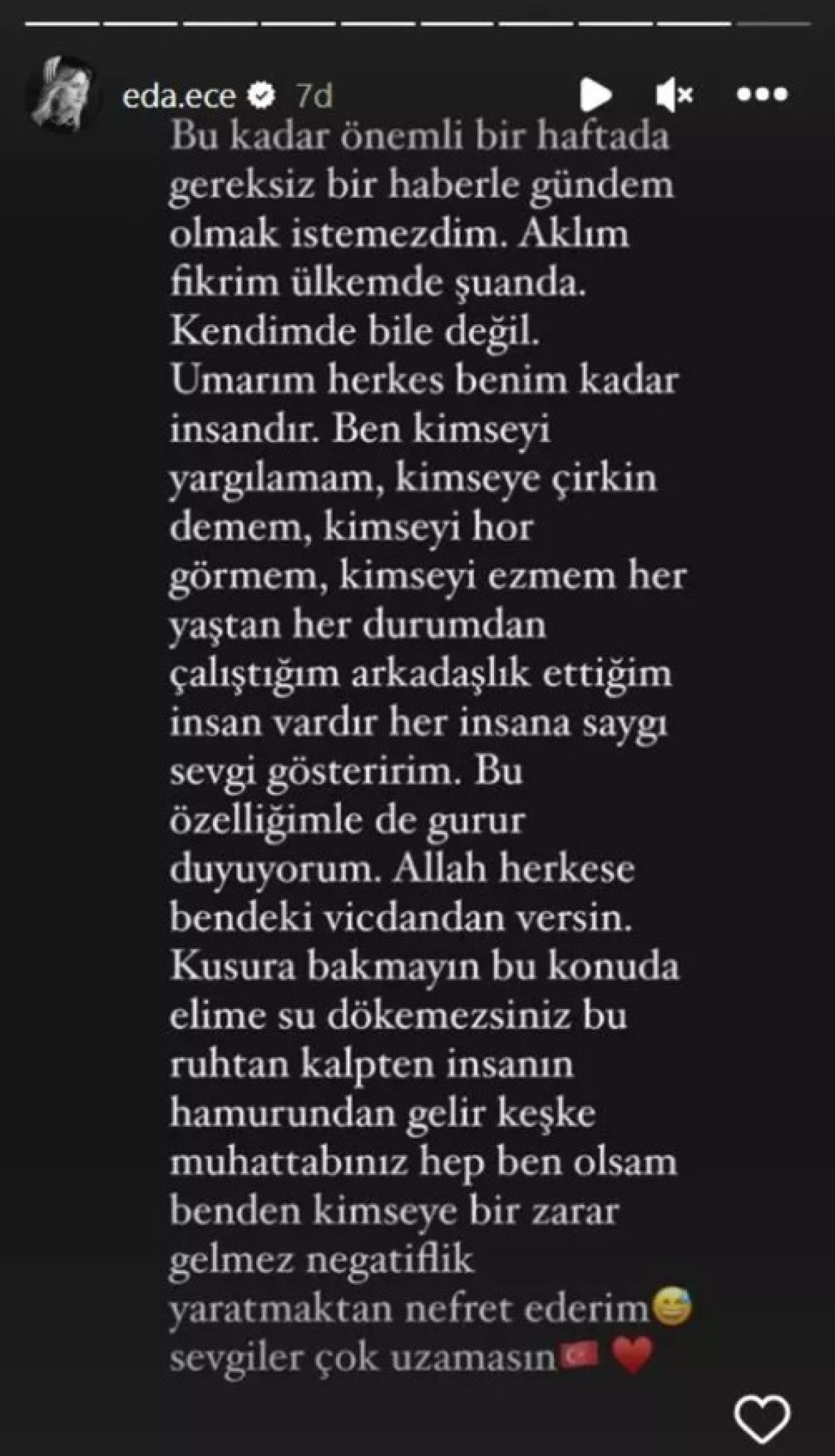 Bu kadar önemli bir haftada gereksiz bir haberle gündem olmak istemezdim. Aklım fikrim ülkemde şu anda. Kendimde bile değil. Umarım herkes benim kadar insandır. Ben kimseyi yargılamam, kimseye çirkin demem, kimseyi hor görmem, kimseyi ezmem her yaştan her durumdan çalıştığım arkadaşlık ettiğim insan vardır. Her insana saygı sevgi gösteririm. Bu özelliğimle de gurur duyuyorum. Allah herkese bendeki vicdandan versin. Kusura bakmayın bu konuda elime su dökemezsiniz. Bu ruhtan, kalpten insanın hamurundan gelir. Keşke muhatabınız hep ben olsam benden kimseye bir zarar gelmez, negatiflik yaratmaktan nefret ederim. Sevgiler çok uzamasın.