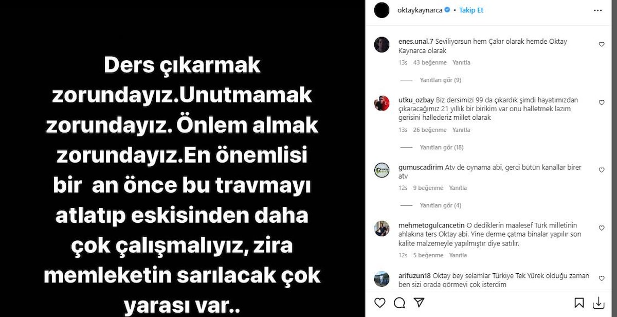 "Ders çıkarmak zorundayız. Unutmamak zorundayız. Önlem almak zorundayız. En önemlisi bir an önce bu travmayı atlatıp eskisinden daha çok çalışmalıyız, zira memleketin sarılacak çok yarası var."