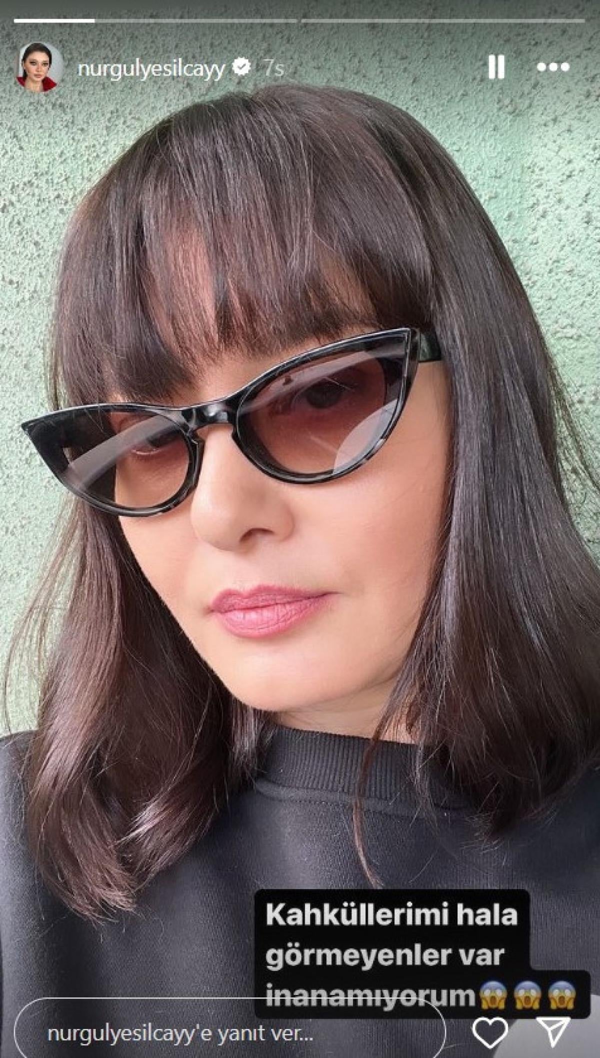 Hikaye kısmından yeni halini paylaşan oyuncu, "Kahküllerimi halan görmeyenler var inanamıyorum." ifadelerini ekledi.