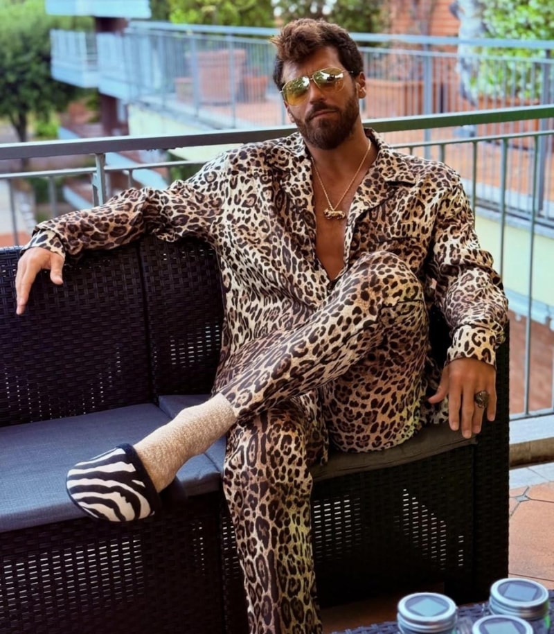 Baştan aşağı leopar desenli bir takım giyen Can Yaman'ın kombinini zebra desenli terlikle tamamladı. Sadece kıyafeti değil oturuş şekli bile yorumlara konu olan ünlü oyuncu, sosyal medyada gündem olmayı yine başardı.