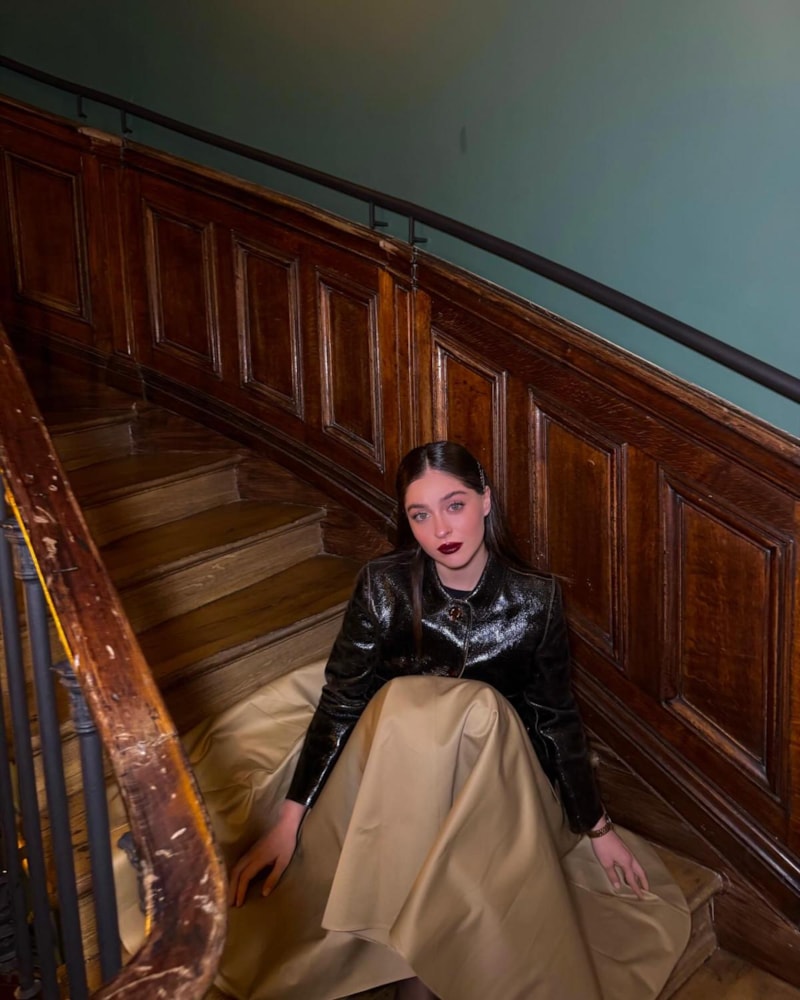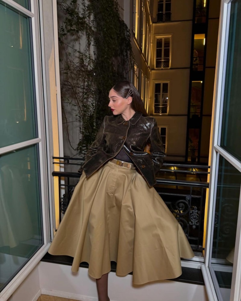 Şeffaf bluzu, kabarık eteği ve ceketiyle şık bir kombin yaratan Cemre Baysel, hayranlarını yine mest etti.