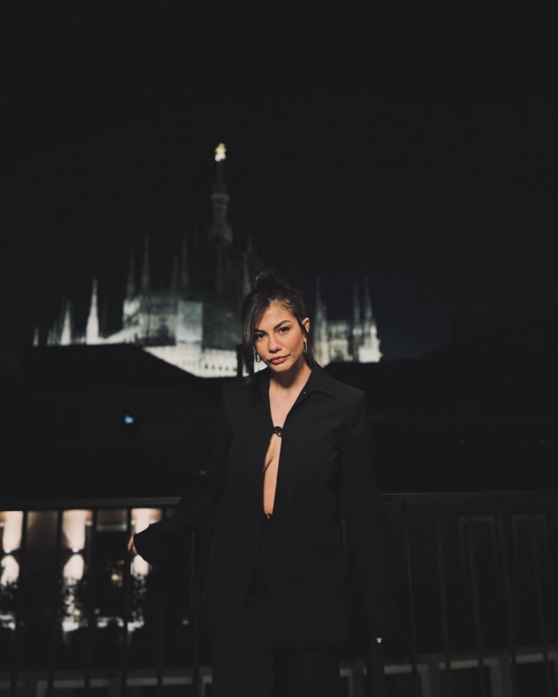 Milano pozlarını peş peşe paylaşan güzel oyuncu, siyah pantolon ceket kombini ile takipçilerinden tam not aldı.