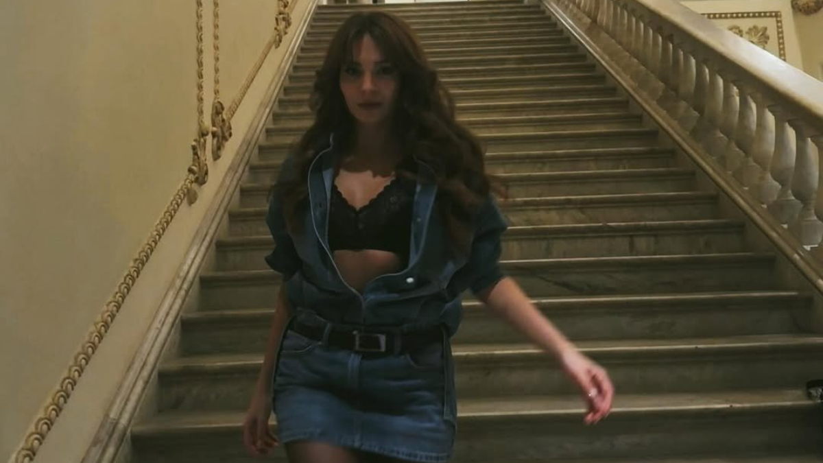 Şahin, jean bir etek ve jean gömlek kombini yaptı. Gömleğinin düğmelerini açan Şahin, siyah dantelle iç çamaşırı ile bakana bir daha baktırdı.