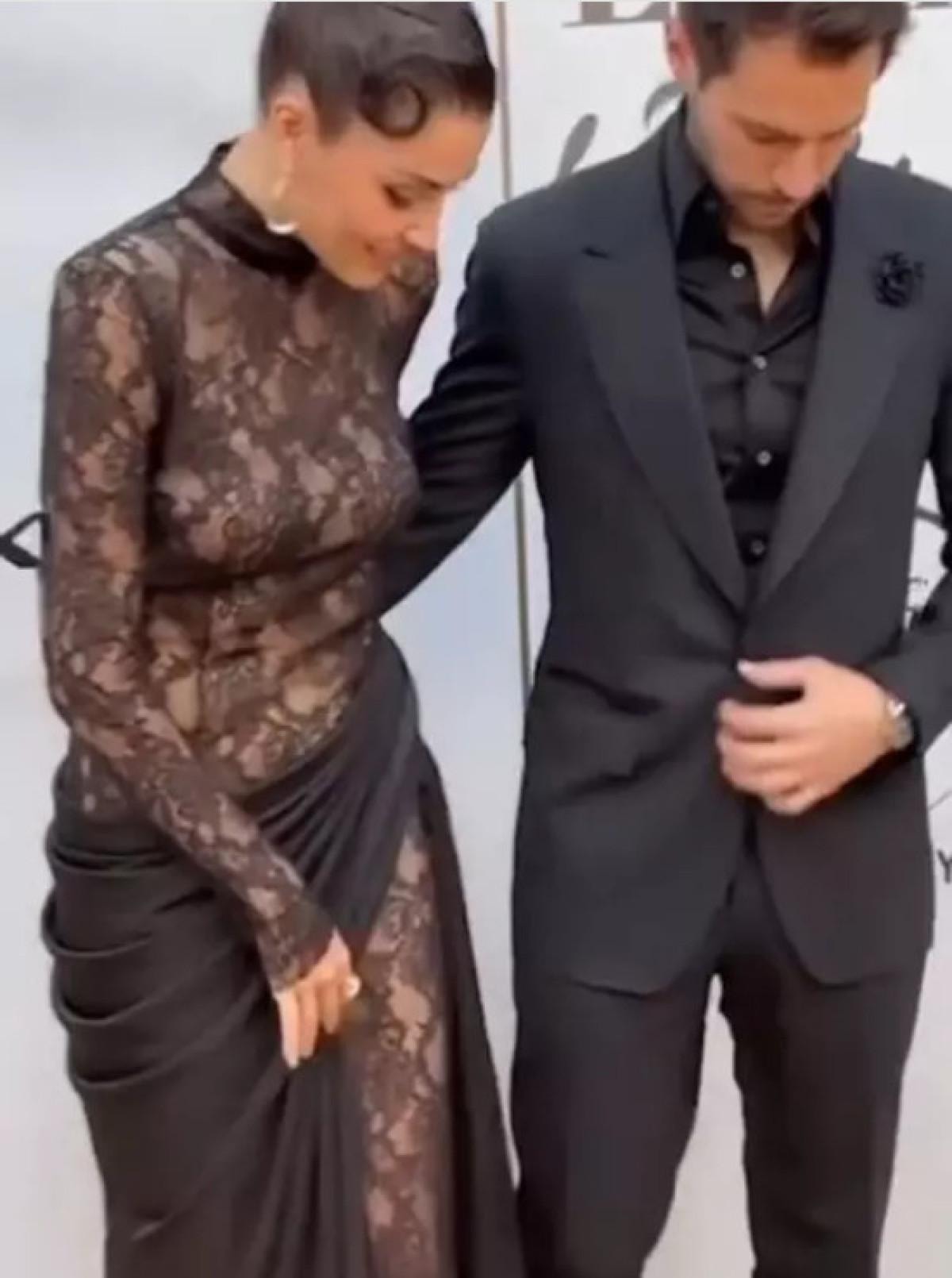 Gecede Hande Erçel, siyah dantel ve transparan detaylara sahip derin bacak dekoltesi olan bir elbise giyerken Sabancı da aynı şekilde sevgilisine siyah takımla eşlik etti.