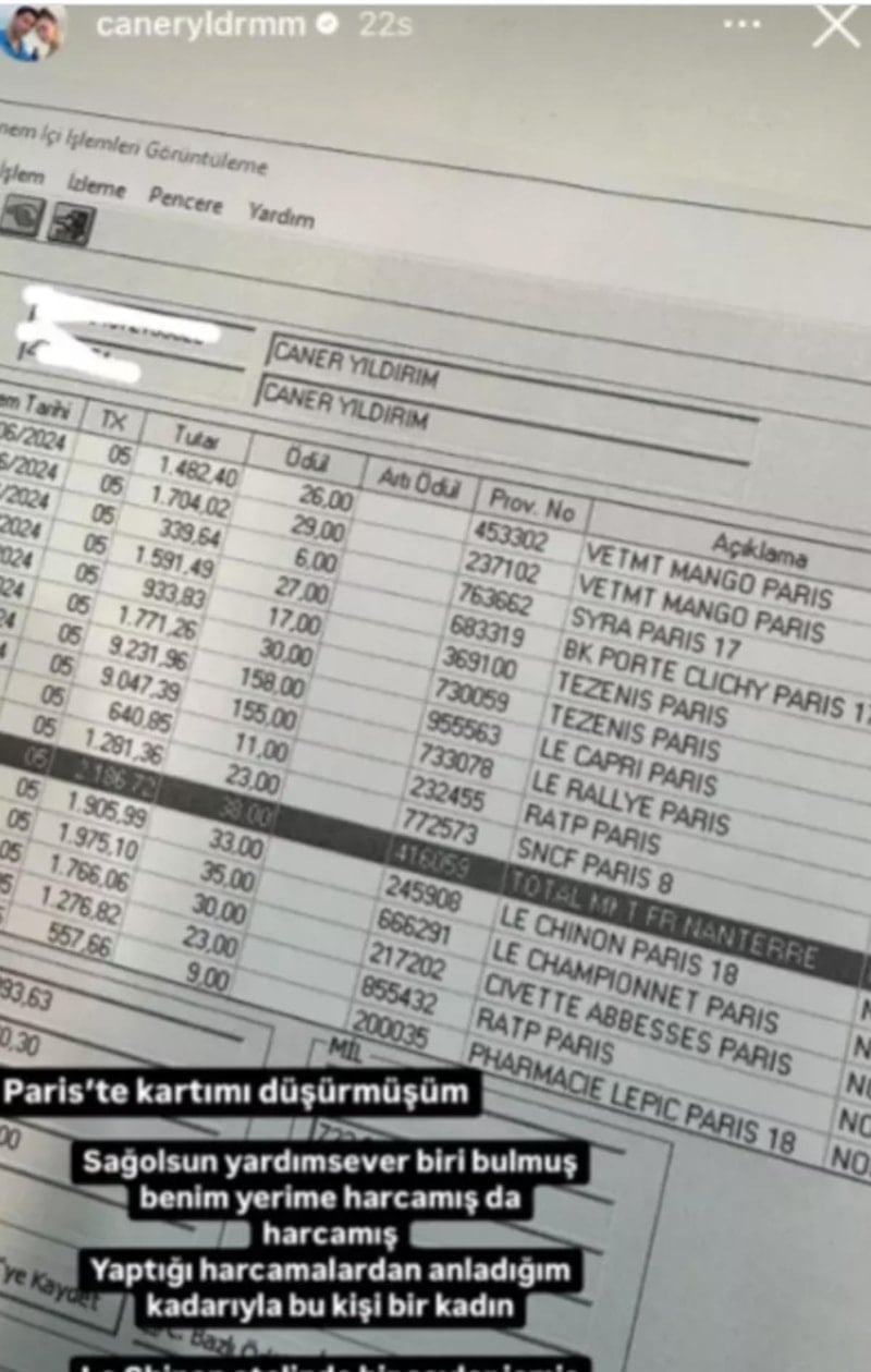 Hande Erçel'in ablası Gamze Erçel'in eşi Caner Yıldırım, Paris'te kredi kartını düşürdü. Bulan kişi doyasıya harcama yaptı.